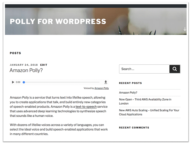 Today AWS in partnership with WP Engine is announcing the release of an Amazon Polly plugin for WordPress. The sample plugin enables WordPress creators to easily add Text-to-Speech capabilities to written content. As voice interaction becomes more common, it’s essential to provide your website’s content in audio formats. And, visitors who are drawn to your websites by voice capabilities can now consume your content through new channels, such as inline audio players and mobile podcast applications. Now your readers and listeners can listen to your posts, even while they are away from the screen – driving, riding a bike, or even jogging.