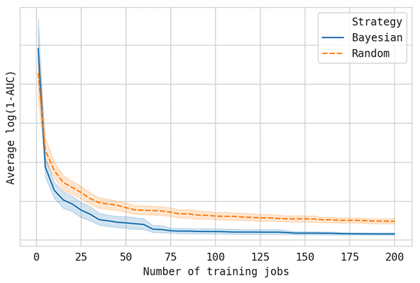 You can see that Bayesian optimization requires one-fourth as many training jobs to reach the same level of performance as random search. You can expect similar results for most tuning jobs.