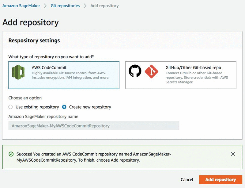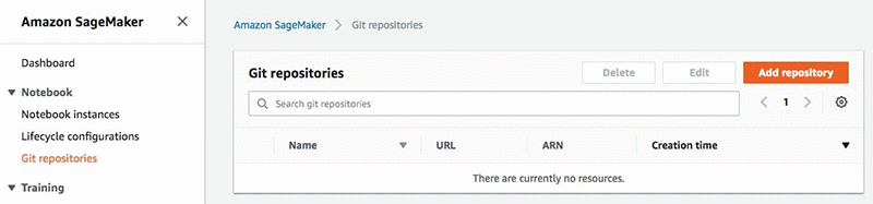 You can also select Add a repository to Amazon SageMaker, which will lead you to the previous menu where we added repositories to Amazon SageMaker.