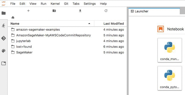 If you open the notebook instance with a JupyterLab interface, the jupyter-git extension is installed and available to use. For information about the JupyterLab Git extension, visit the JupyterLab GitHub page.