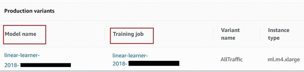 In the left navigation pane of the Amazon SageMaker console, choose Endpoints, and select the relevant endpoint from the list of all your deployed endpoints. Scroll to Endpoint Configuration Settings, which lists all the model versions deployed at the endpoint. You see an additional hyperlink to the model training job that created that model in the first place.