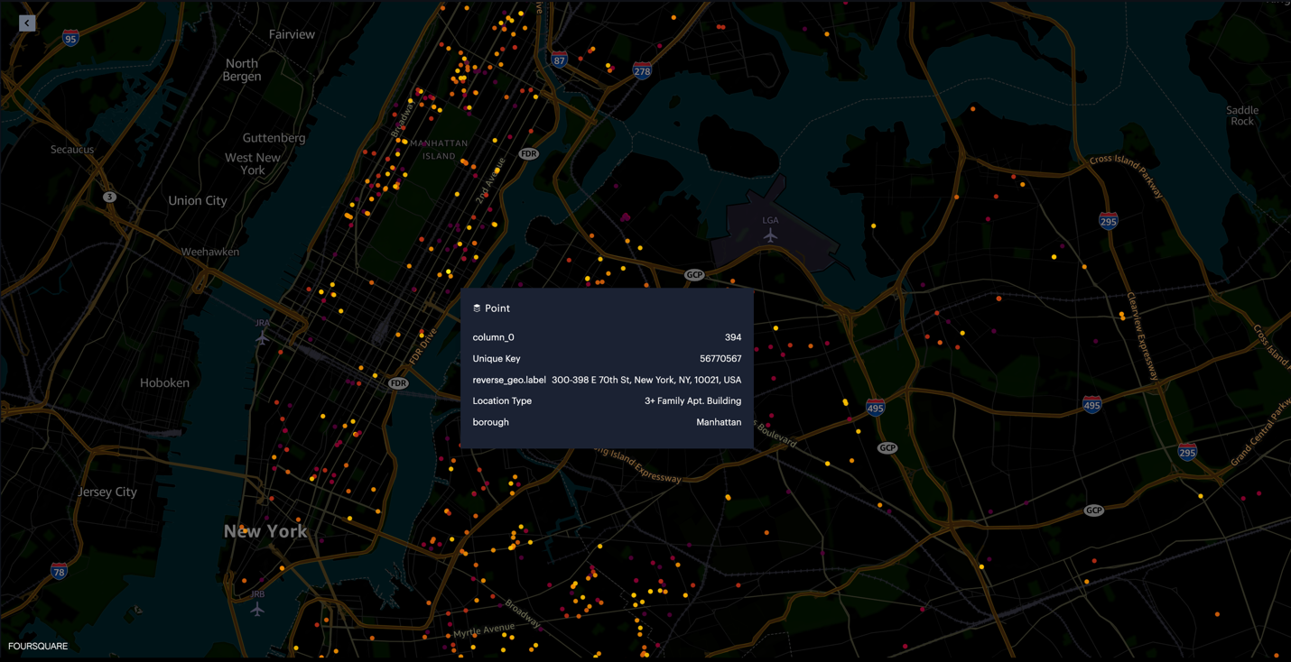 From the output file generated by VEJ, we can use SageMaker geospatial capabilities to overlay the output on a base map and provide layered visualization to make collaboration easier. SageMaker geospatial capabilities provide built-in visualization tooling powered by Foursquare Studio, which natively works from within a SageMaker notebook via the SageMaker geospatial Map SDK. Below, we can visualize the rodent sightings and also get the human readable addresses for each of the data points. The address information of each of the rodent sightings data points can be useful for rodent inspection and treatment purposes.