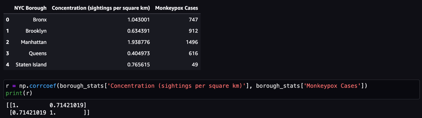 This is supported by a simple statistical analysis of calculating the correlation between the concentration of rodent sightings and monkeypox cases in each borough. The calculation produced an r value of 0.714, which implies a positive correlation.