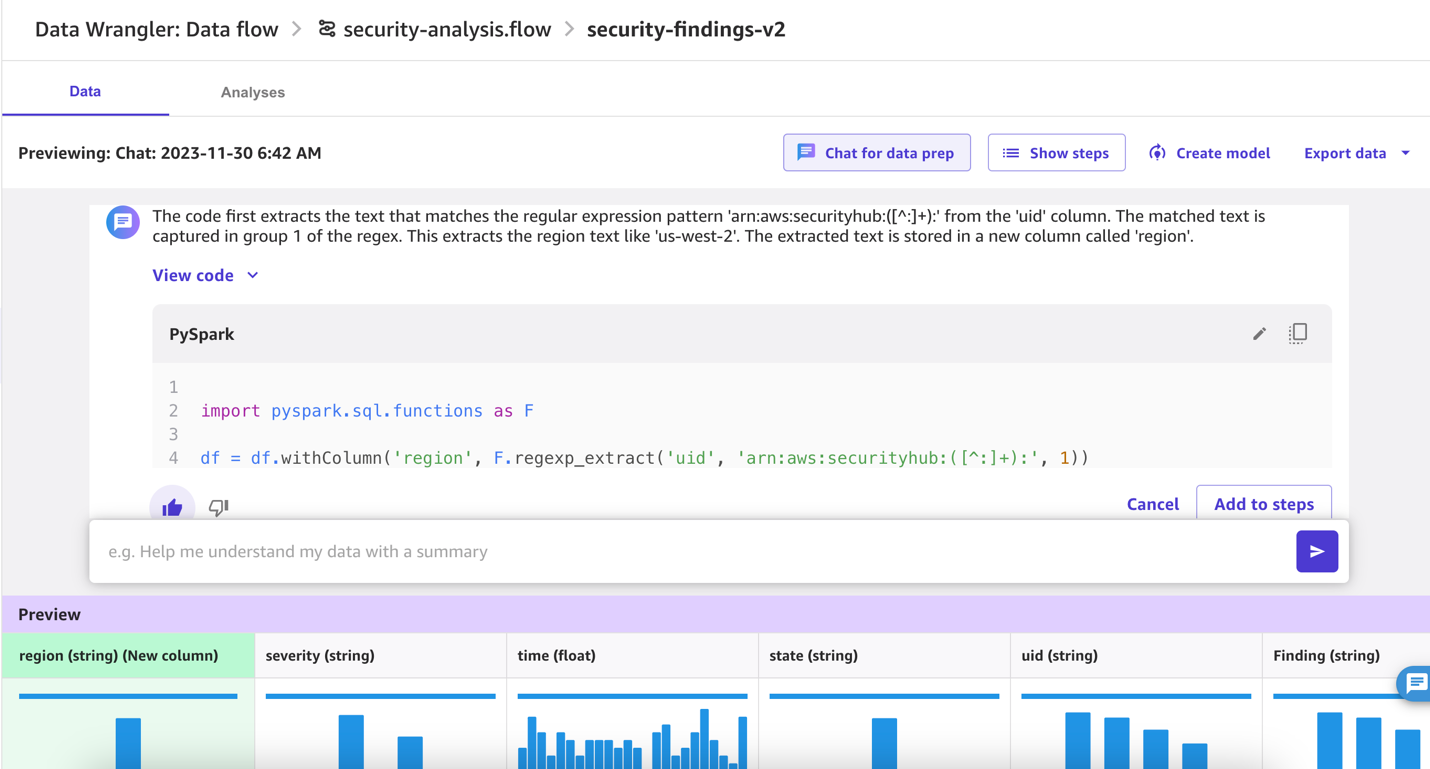 In this post, we demonstrate three key transformations; filtering, column renaming, and text extraction from a column on the security findings dataset. We also demonstrate using the chat for data prep feature in SageMaker Canvas to analyze the data and visualize your findings.