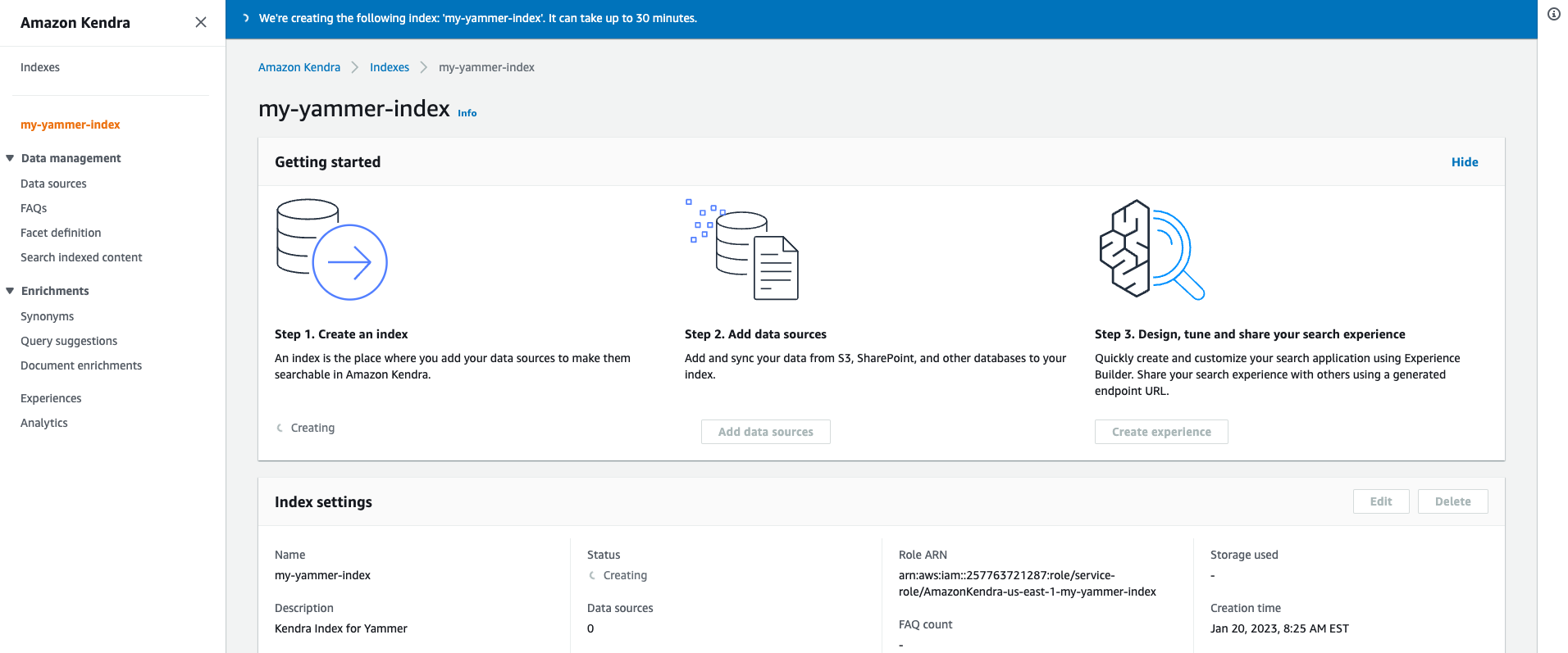 - Create an Amazon Kendra index.