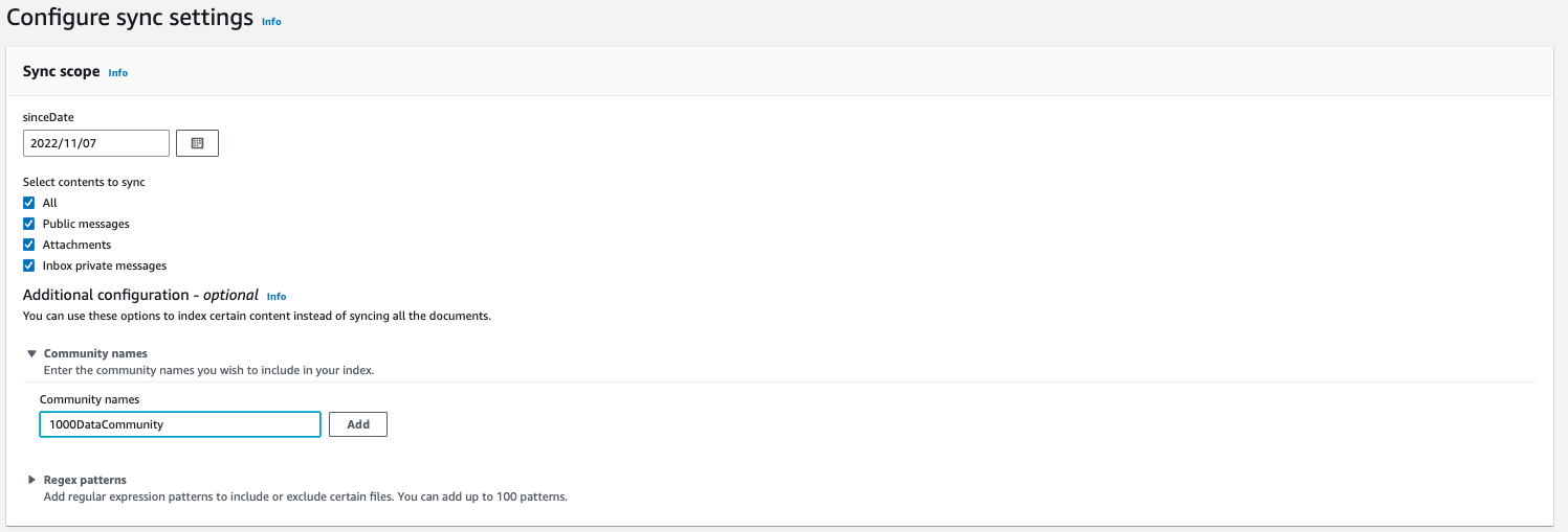 - In the Configure sync settings section, you can optionally configure contents to sync, communities to include, and date since.