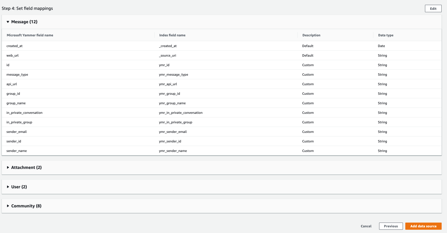 To learn about these possibilities and more, refer to the Amazon Kendra Developer Guide. For more information on how you can create, modify, or delete metadata and content when ingesting your data from Yammer, refer to Enriching your documents during ingestion and Enrich your content and metadata to enhance your search experience with custom document enrichment in Amazon Kendra.