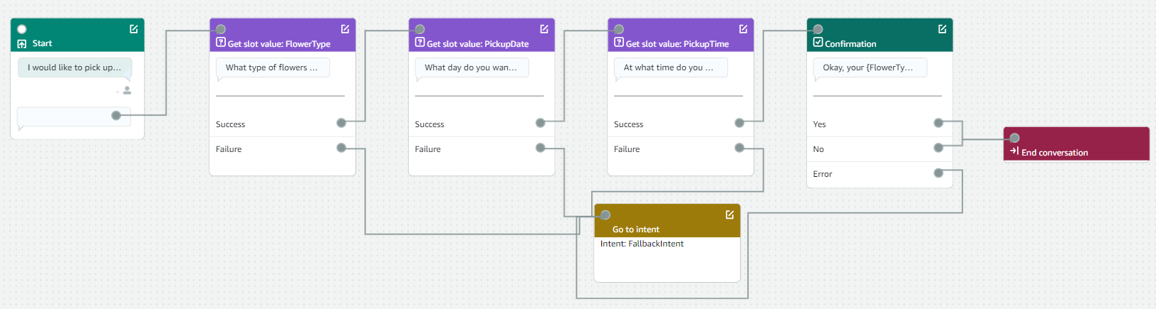 Take the Order Flowers bot as an example. The OrderFlowers intent, when viewed in the visual builder, uses five blocks: Start, three different Get slot value blocks, and Confirmation.
