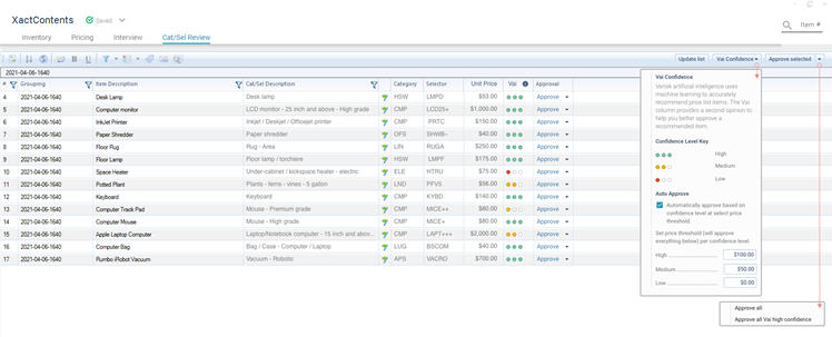 In the following figure, we present an early rendition of the software UX that can be presented to insurance adjustors. As the user enters the item description, the category, selector, and price fields are automatically filled using of the models described earlier. Along with the predictions is a confidence rating to aid in a rapid manual review.