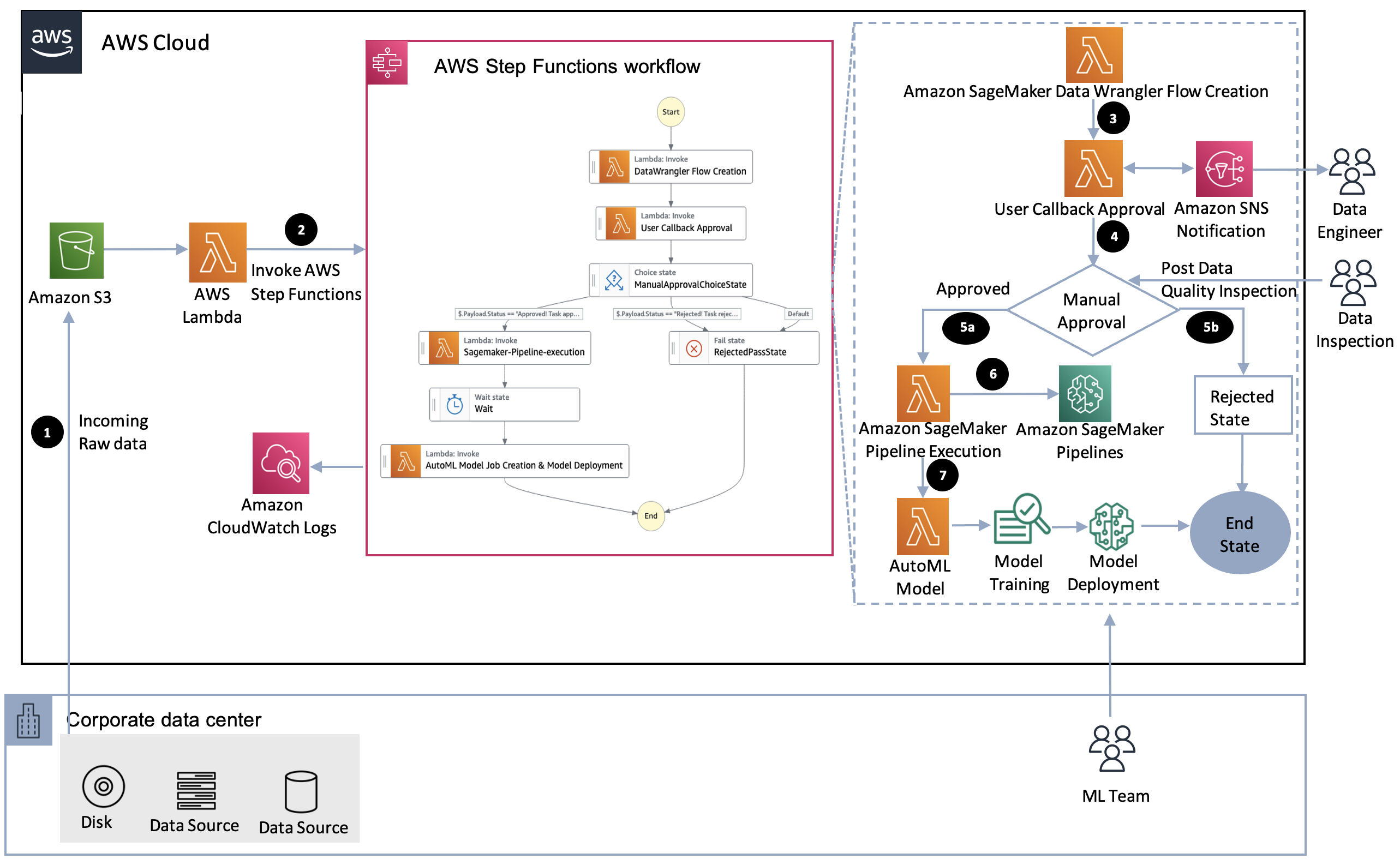The following architecture showcases the end-to-end automation of data transformation followed by human in the loop approval to facilitate the steps of model training and deployment.