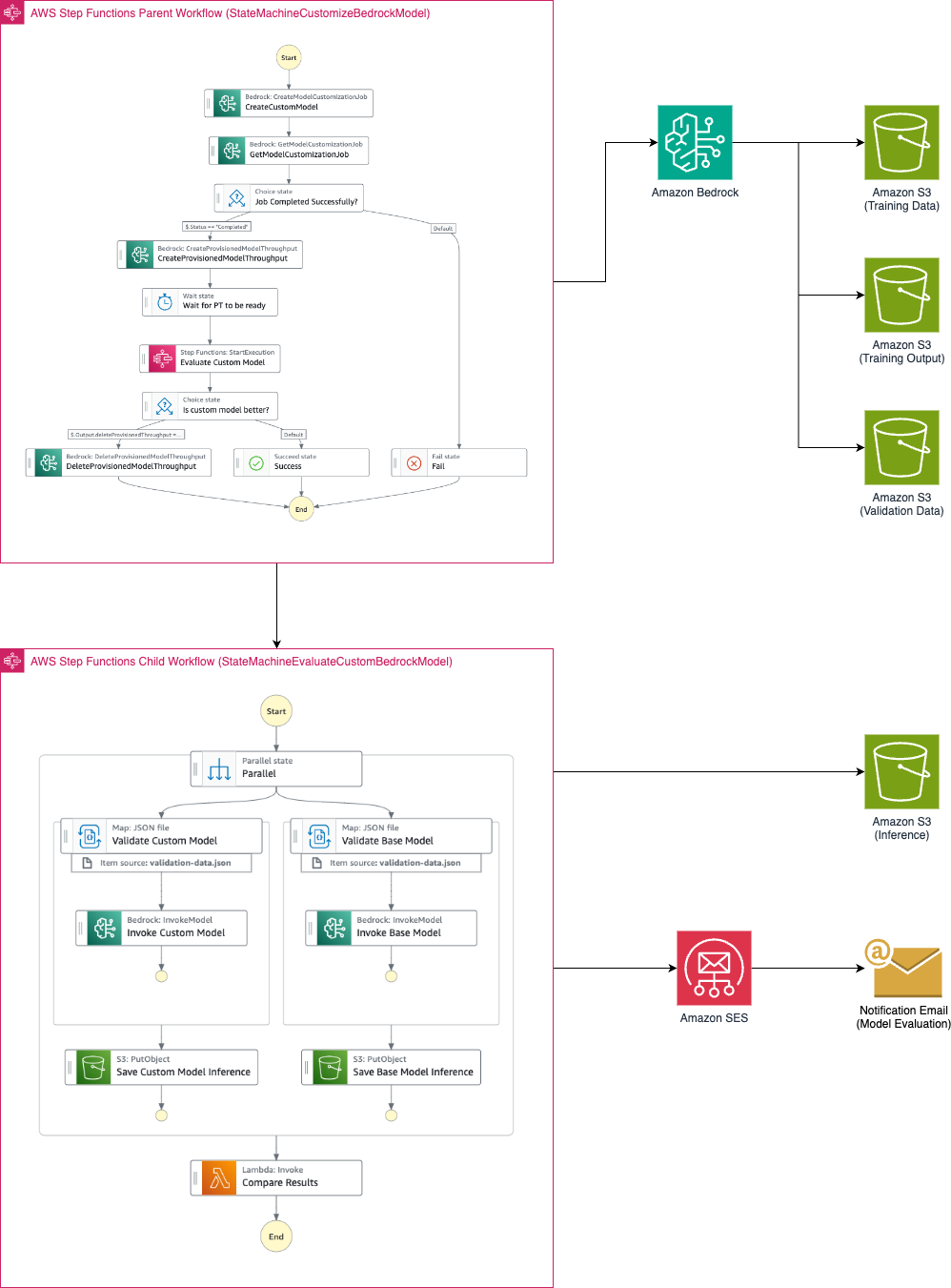 CreateProvisionedModelThroughputAPI to create a provisioned throughput with no commitment. - The parent state machine calls the child state machine to evaluate the performance of the custom model with respect to the base model.
