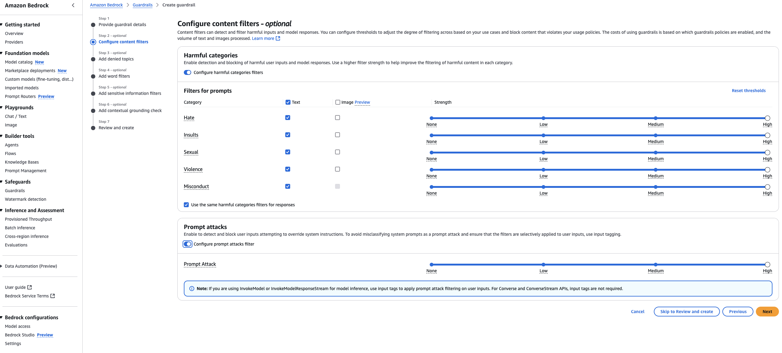 - As shown in the following screenshot, select the content filters you want to implement for your Amazon Bedrock based application
