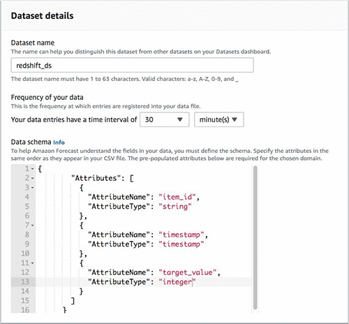 After we create the dataset group, we create a time series dataset and add it to the dataset group. When creating a dataset, we specify the metadata for the time series, such as schema and data frequency. The following screenshot shows the schema, where the item_id is the warm pool ID, and the target_value is the number of nodes for each request. The preparation duration for the host determines the data frequency (i.e. the time between calling an Amazon EC2 RunInstance API and when the instance becomes available to serve as a cluster node). We track this duration by using CloudWatch metrics. Finally, we proceed to use the dataset import job to copy our data from S3 to Forecast.