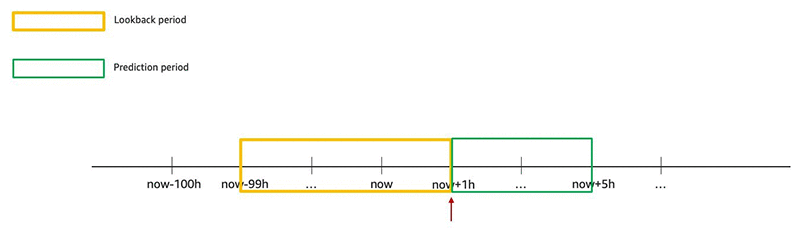 We repeat this process one hour later by moving forward both the look-back period and the prediction period by one hour.