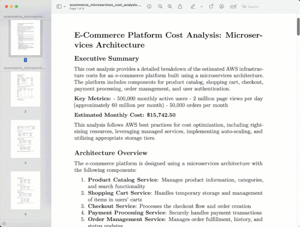 Create a cost analysis for an e-commerce platform with microservices architecture. Include components for product catalog, shopping cart, checkout, payment processing, order management, and user authentication. Assume moderate traffic of 500,000 monthly active users, 2 million page views per day, and 50,000 orders per month. Ensure the analysis follows AWS best practices for cost optimization. Convert estimation to a PDF format.