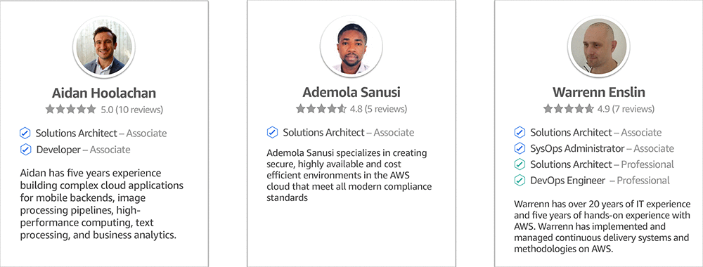 All IQ experts are US-based and have verified AWS Certifications. When you are matched with experts, you choose who you want to work with. AWS IQ shows you detailed profiles, ratings, and review history. The following screenshot shows a few experts you may get matched with.