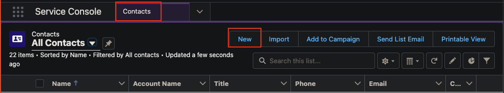 - On the Service Console page, choose Contacts from the drop-down list, then choose New.