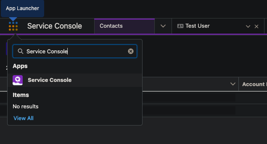 - Under App Launcher, search for and choose Service Console.