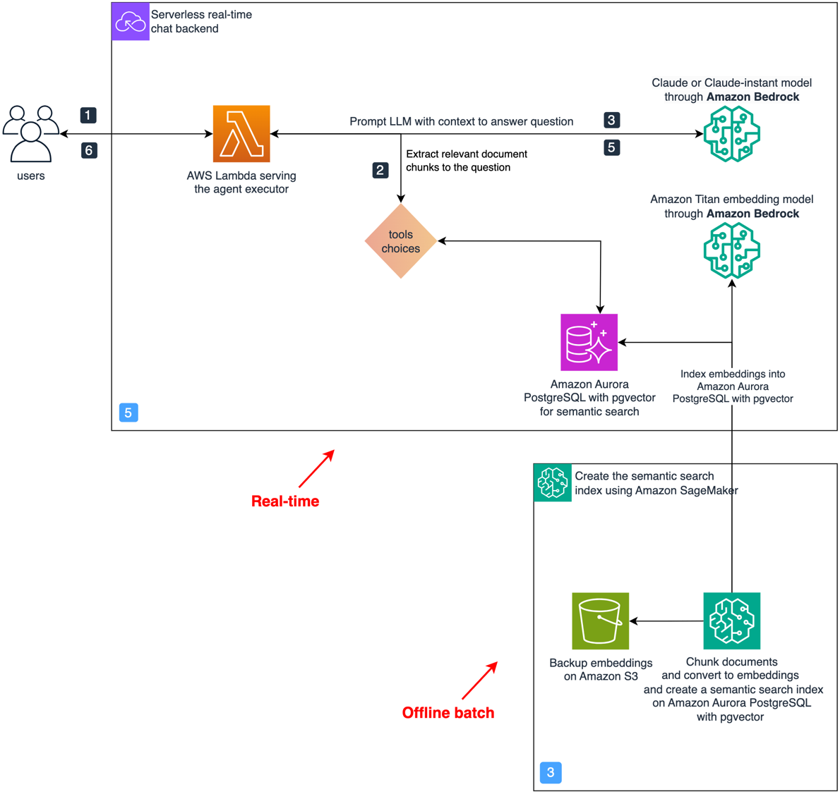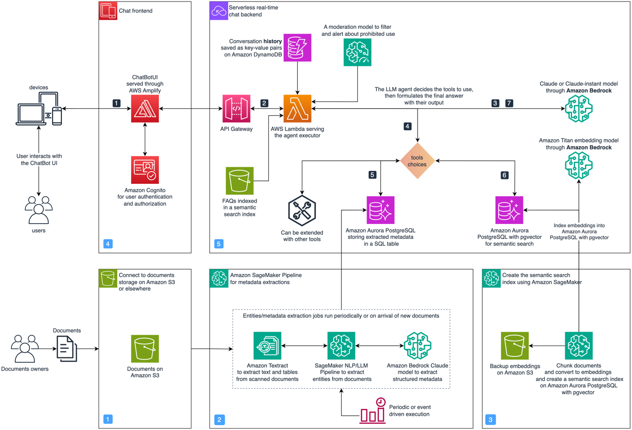 The solution we propose uses RAG with semantic search in component 3. You can implement this module using Amazon Bedrock Knowledge Bases. Additionally, there are a variety of others options to implement RAG, such as the Amazon Kendra Retrieval API, Amazon OpenSearch vector database, and Amazon Aurora PostgreSQL with pgvector, among others. The open source package aws-genai-llm-chatbot demonstrates how to use many of these vector search options to implement an LLM-powered chatbot.