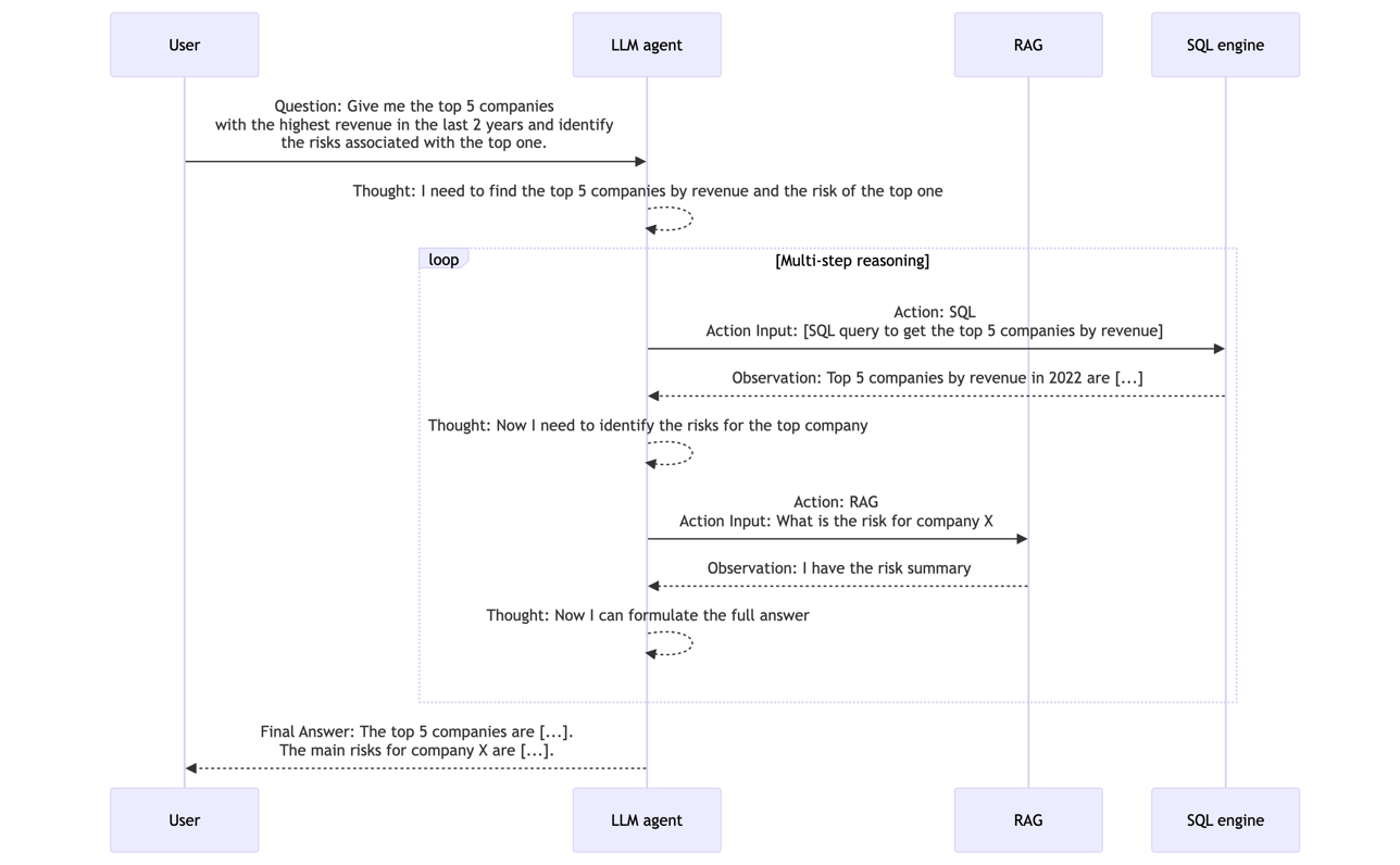 The following sequence diagram explains how a ReAct agent works toward answering the question “Give me the top 5 companies with the highest revenue in the last 2 years and identify the risks associated with the top one.”