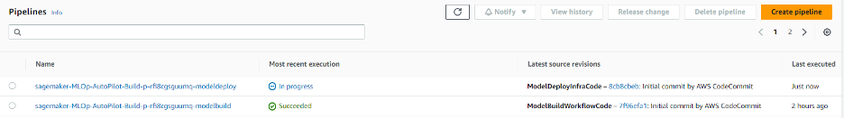 - The first seed code commit starts a CI/CD pipeline using CodePipeline that triggers a SageMaker pipeline, which is a series of interconnected steps encoded using a directed acyclic graph (DAG). In this case, the steps involved are data processing using a Data Wrangler flow, training the model using Autopilot, creating the model, evaluating the model, and if the evaluation is passed, registering the model.