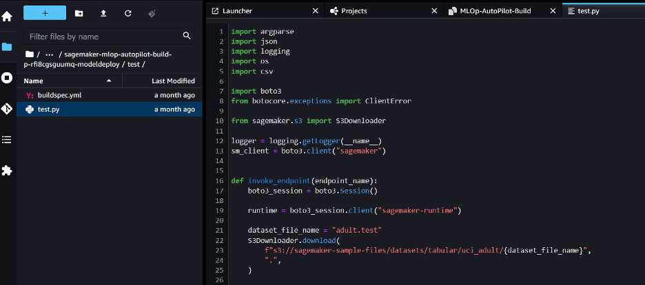 - TestStaging – In the second-sub stage, automated testing is performed using CodeBuild on the endpoint to check if the inference is happening as expected. The test results will be available in the S3 bucket with the name