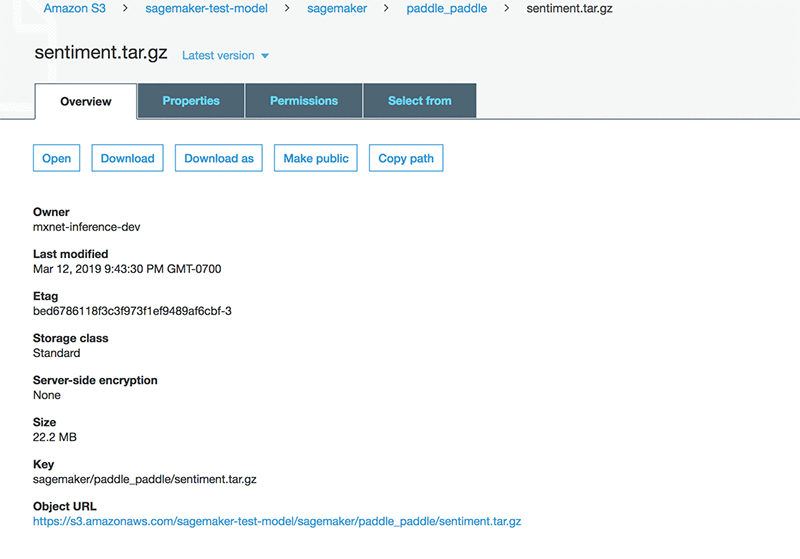 - Upload the model archive sentiment.tar.gz created earlier to an Amazon S3 bucket. For this post, we uploaded it to an S3 bucket called paddle_paddle.