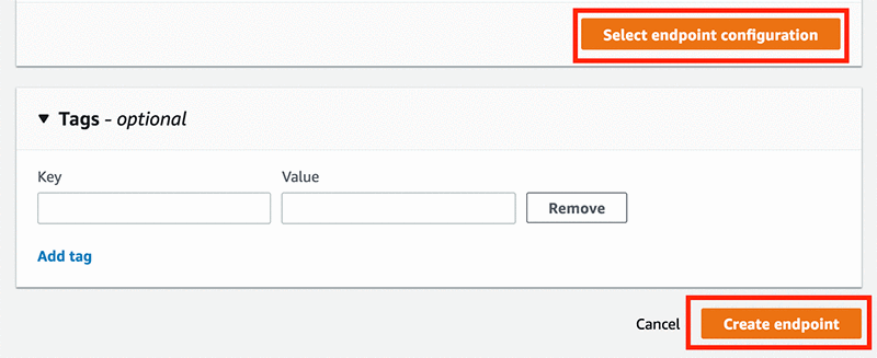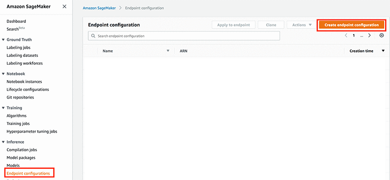 - In the left navigation pane, choose Endpoint Configurations, Create endpoint configuration.
