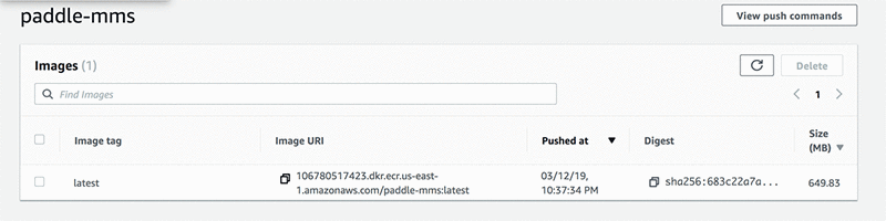 - Upload the container image created earlier, paddle-mms, to an Amazon ECR repository. For this post, we created an ECR repository called “paddle-mms” and uploaded image there.