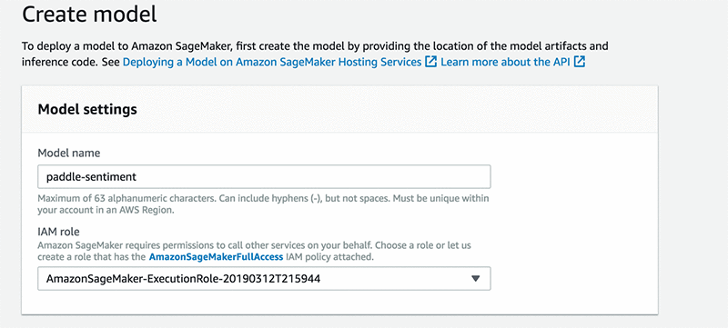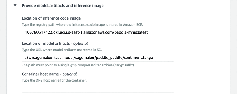 - Provide values for Model name, IAM role, location of inference code image (or the ECR repository), and Location of model artifacts (which is the S3 bucket where the model artifact was uploaded).