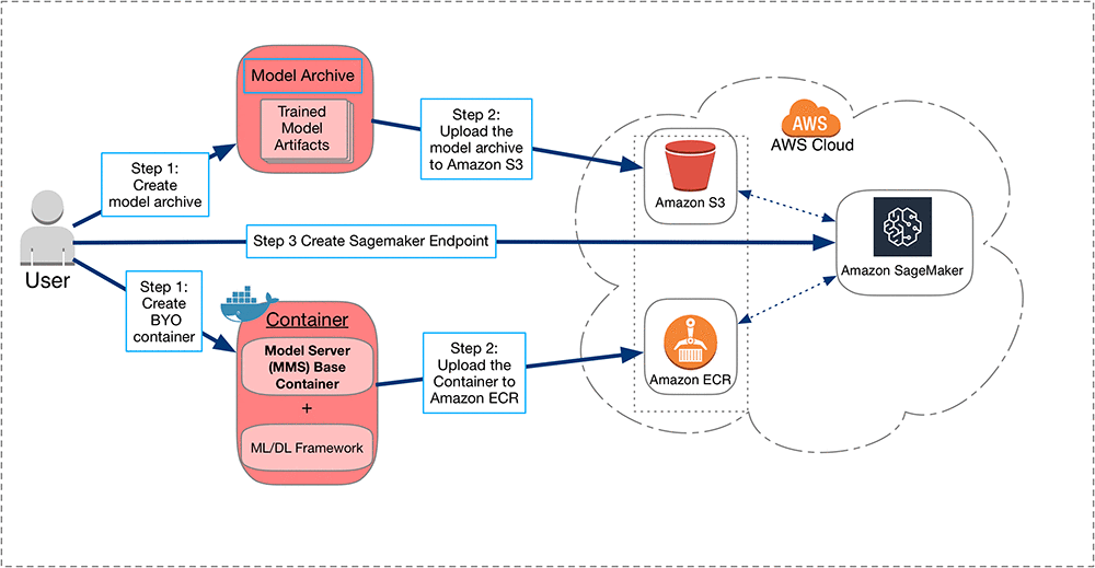 As this diagram shows, you need two main components to bring your ML/DL framework to Amazon SageMaker using an MMS BYO container: