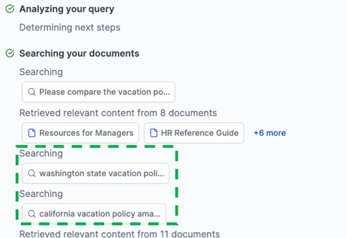 Because Agentic RAG presumes a series of parallel steps to explore the data source and collect thorough information for more accurate query resolution, we are now providing real-time visibility into its processing steps that will be displayed on the screen as data is being retrieved to generate the response. After the response is generated, the steps will be collapsed with the response streamed. In the following image, we see how the decomposed queries are displayed and the relevant data retrieved for response generation.