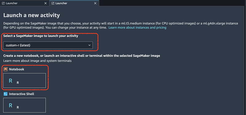 When in the Studio environment, you can use the Launcher to launch a new activity, and should see the custom-r (latest) image listed in the dropdown menu under Select a SageMaker image to launch your activity.