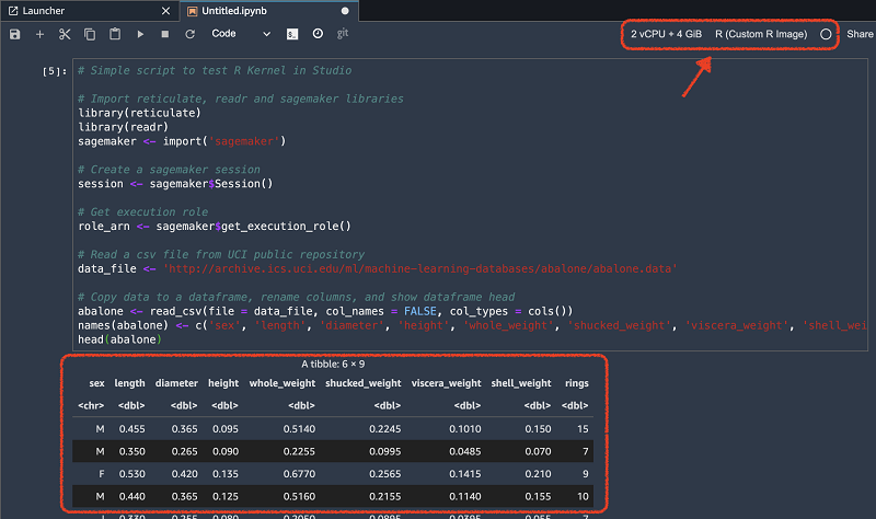 If this is the first time you’re using this kernel to create a notebook, it may take about a minute to start the kernel, and the Kernel Starting message appears on the lower left corner of your Studio. You can write R scripts while the kernel is starting but can only run your script after your kernel is ready. The notebook is created with a default ml.t3.medium instance attached to it. You can see R (Custom R Image) kernel and the instance type on the upper right corner of the notebook. You can change ML instances on the fly in SageMaker Studio. You can also right-size your instances for different workloads. For more information, see Right-sizing resources and avoiding unnecessary costs in Amazon SageMaker.