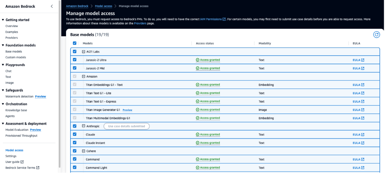 - If Amazon Titan Text Embeddings is enabled, the access status will state Access granted.