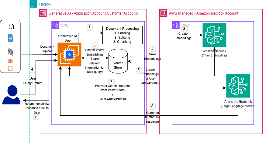 - Embedder – To populate the vector store, an embedding model encodes source documents into vector representations consumable by the retriever. Models like Amazon Titan Embeddings G1 – Text v1.2 are ideal for this text-to-vector abstraction.