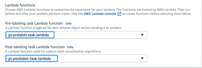 7. For Pre-labeling task Lambda function and Post-labeling task Lambda function, choose “gt-prelabel-task-lambda” and “gt-postlabel-task-lambda” using respective dropdown and then choose Submit.