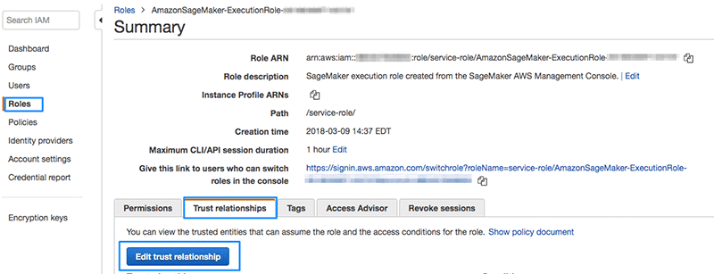 2. On the Summary page, choose Trust relationships, then choose Edit trust relationship to edit the trust policy.