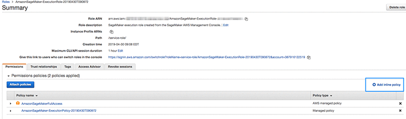 1. In a new browser tab, open the IAM console. In the navigation pane, choose Roles, and search for the IAM role that you created in Step 2 (the role name typically starts with AmazonSageMaker-ExecutionRole-). For Role name, choose the name.