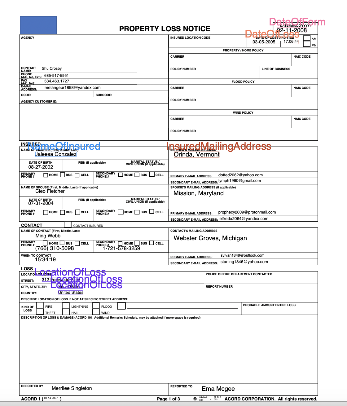 DateOfForm,DateOfLoss,NameOfInsured,LocationOfLoss, andInsuredMailingAddress. - The manifest file references both the source PDF location and the annotation location.