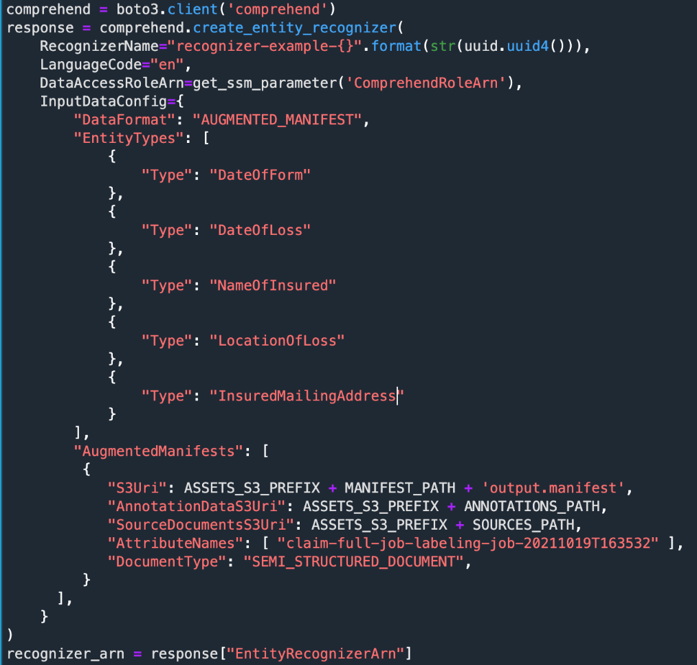 Let’s run inference with our trained model on a document that was not part of the training procedure. We can use this asynchronous API for standard or custom NER. If using it for custom NER (as in this post), we must pass the ARN of the trained model.