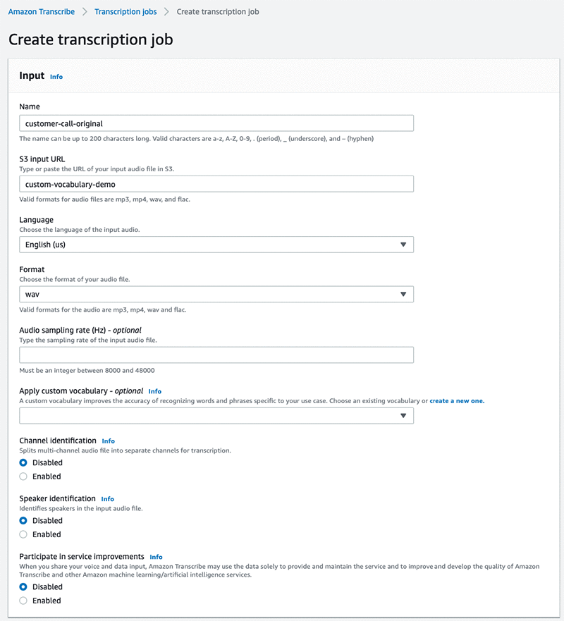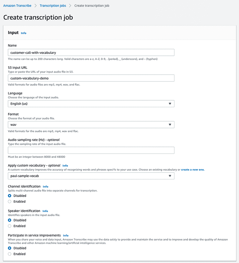 Ok, so now we can start another new transcription job for the same audio file, but this time, we’ll invoke the custom vocabulary text file to see the accuracy results. The process is the same as we had been through before, except this time we will actually designate a custom vocabulary “paul-sample-vocab”. And of course, I’ll name the transcription job something different from the first one, like “customer-call-with-vocabulary”: