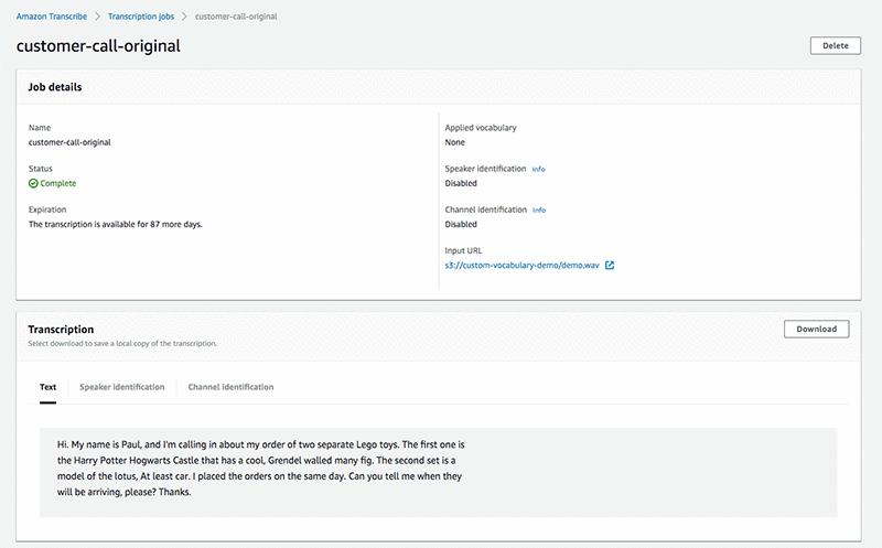 In the next screen you’ll see that the transcription job has completed with a preview window showing you the output text: “Hi. My name is Paul, and I’m calling in about my order of two separate Lego toys. The first one is the Harry Potter Hogwarts Castle that has a cool, Grendel walled many fig. The second set is a model of the lotus, At least car. I placed the orders on the same day. Can you tell me when they will be arriving, please? Thanks.”