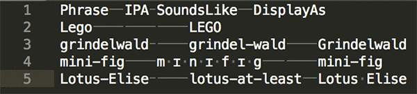 So, let’s see how we can use the custom vocabulary feature’s custom pronunciation to enhance the transcription output. First, we need to prepare a vocabulary file, which not only lists the custom terms (Phrase), but also indicates the corresponding pronunciations.