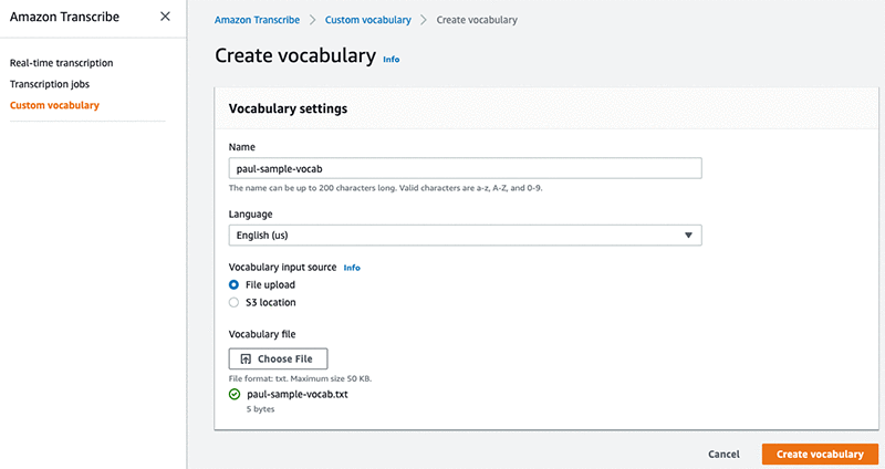 So now, all I have to do is upload this text file via the Amazon Transcribe Console by uploading the vocabulary file and clicking “Create Vocabulary”: