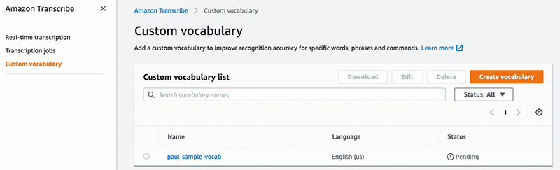 We can confirm that the custom vocabulary was successfully generated, as it will be visible in the custom vocabulary list: