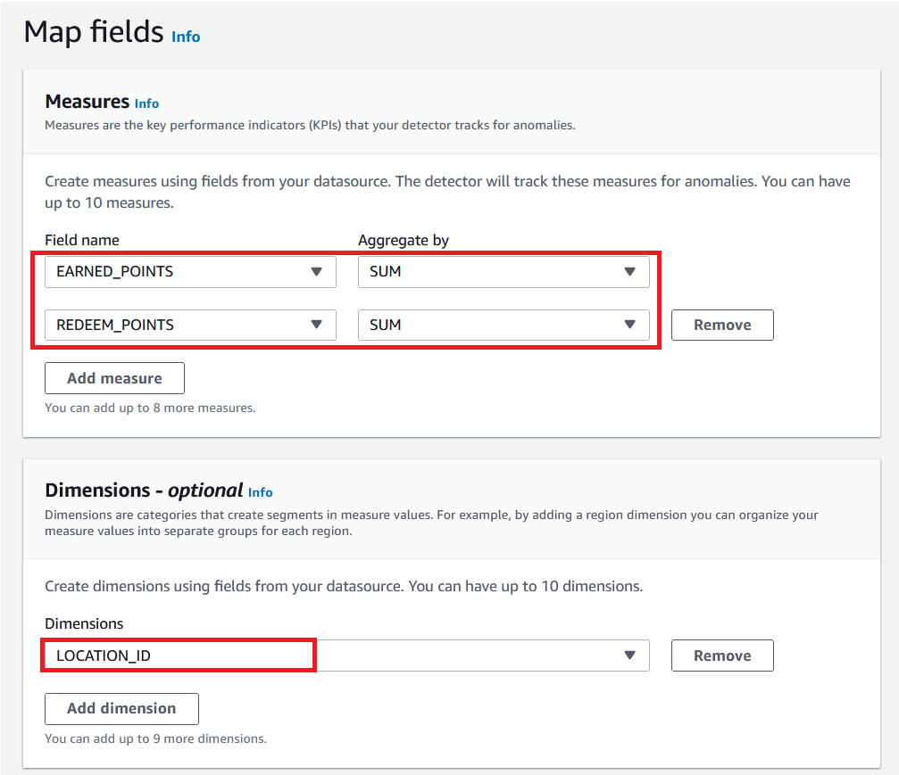 Measures define KPIs that you want to track anomalies for. You can add up to five measures per detector. The fields that are used to create KPIs from your source data must be of numeric format. The KPIs can be currently defined by aggregating records within the time interval by doing a SUM or AVERAGE.