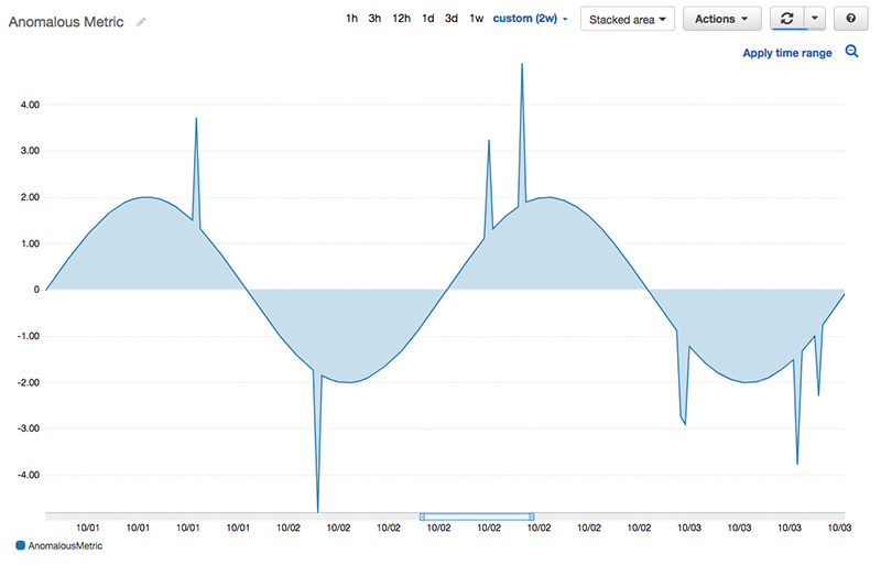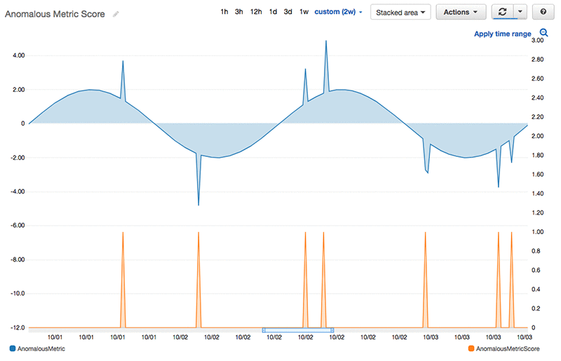 - The final Lambda function (“Publish Anomaly Score Metric to CloudWatch”) gets output scores from the batch transform job. It uses a simple, standard technique for classifying anomalies in which all anomaly scores outside three standard deviations from the mean score are considered anomalous. Finally, all the data points that have been labeled as anomalous are published to CloudWatch with a value of 1, and all the data points that haven’t been marked as anomalous are published with a value of 0. To know for which timestamp to publish the anomalous score metric, we use the input dataset.