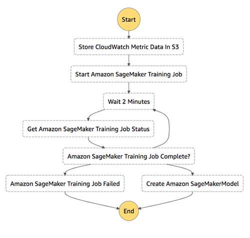 - The second Lambda function (“Start SageMaker Training Job”) uses the S3 dataset created in the previous step to start an Amazon SageMaker training job. The creation of the job is executed in asynchronous fashion and the execution of the state machine continues.