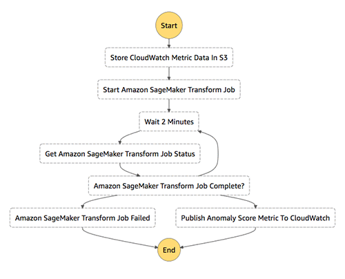 - AWS Step Functions– Getting data from CloudWatch, uploading it to S3, starting the training and batch transform jobs, and publishing the results back to CloudWatch are all steps that we need so that our anomaly detection tool works as expected. Instead of writing a new service to orchestrate this workflow, we’ll use serverless technologies to simplify the process, and we’ll automate the process using AWS Step Functions. We’ll use two state machines, one for training and one for batch inference, which will ensure that all of the described steps are being executed in the correct order and that any failures are handled gracefully.